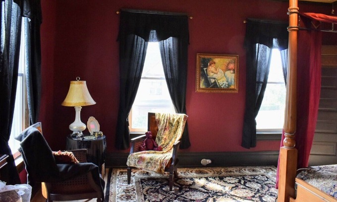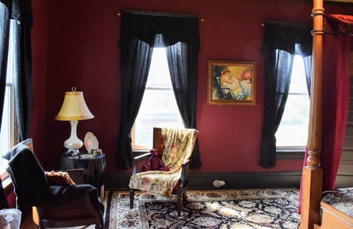 The BellaDonna Inn operates as a Bed & Breakfast, featuring three luxuriously appointed rooms each with its own individual character. All three rooms are located on the second floor. A full gourmet breakfast is served daily in the Dining Room or the Gentleman’s Sitting Room. A coffee and tea center is located between the rooms for your convenience. Guests also have access to the Library / TV room on the guest floor. The Black Orchid Suite is decorated in a high Victorian Gothic style and features a luxurious and roomy king size bed, an intimate seating area and en suite bath with a large claw foot tub.
