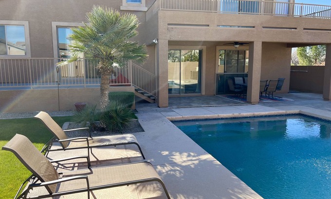 Introducing your home away from home. Centrally located it offers easy access to all the best that the valley has to offer. 5 BD and 4BR with a finished basement. Enjoy stunning sunsets and mountain views and take a dip in the beautiful pool. Conveniently near the interstate, you'll have access to all the area's top attractions. Plus, walking distance to the Stadium and West Gate, and close to Top Golf. Perfect for events like Waste Management, Spring Training, Phoenix Suns, and concerts.