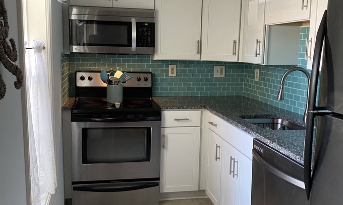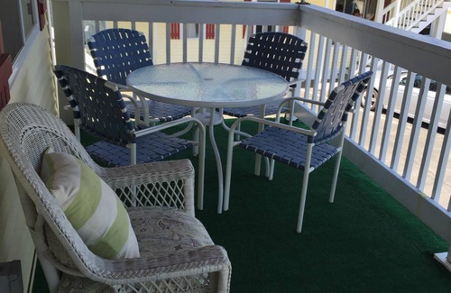 Our two story home is air conditioned AC with 3 bedrooms and 2 full baths. Over the years, we have made many updates giving our home a beachy and clean feel. We offer two separate sitting areas with flatscreen TVs and free wifi. There is an enclosed patio connected to the kitchen with additional seating. This is a great space to store your stroller and towels from the rain. A covered deck on the 2nd floor offers shade and a great view of the action on the street plus you can even see a partial view of the ocean. It’s also a great spot to play cards and watch the Thursday night fireworks! Brand new deck added to enjoy the outdoors sitting at the bar and hang your towels. Washer/dryer as well as a small fridge are available on the second floor for your use. One bedroom on the 1st floor with a queen bed. The remaining two bedrooms are upstairs, one has a queen bed and the other with a double bed and a twin over double bunk bed. The upstairs couch pulls out to sleep additional guest with a max of 10 people.