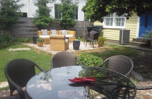 A stroll down a cobblestone path leads you through a beautifully landscaped tropical garden to a perfect little hideaway. This private courtyard is for the guests use and provides both dining and relaxing in this charming New Orleans garden. Open the front door to a fully-stocked kitchen and conveniently located bathroom. The bedrooms, an open living room, reading nooks and a large bathroom all await you upstairs. An ideal layout for families, friends, couples, and dog-lovers ready to paint the town.