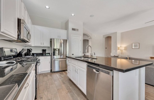 Walk in and immediately feel at home with a great open floor plan. There is a living room with a sofa, 2 chairs and a pool table/ping pong combo and across from that is a flex room with a futon for additional sleeping and a 26" Roku Smart TV ONLY. We know just how important it is to prepare your meals during your stay so you can enjoy the beautiful, equipped kitchen that features refrigerator (no ice maker), microwave, stove/oven, dishwasher, toaster, kitchen utensils, traditional and a Keurig coffee maker, kitchen table seating for 6 plus 4 barstools at the kitchen counter. Just off the kitchen is the family room which features a sectional sofa, chair and a 58” Smart ROKU TV with Streaming Services ONLY and nice natural lighting that comes in the windows and looks out onto the back patio and sparkling pool.