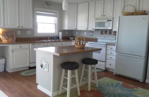 Bigger than it looks...says EVERY guest and they love the beautiful waterviews! This sunny, open house has guests enjoying the sunrise from the front deck. in 2014, this house went through a complete renovation..almost like new, All new plumbing, electric, layout...so almost a new house, but some nice older home charms. As you enter through the large front doors, you will want to relax on the sofas or comfy chairs in the livingroom and once again enjoy the views..keep going to the dining area that seats 6 to 8 with a French door out to a patio with BBQ grill...the fully equipped kitchen with island, dishwasher, microwave, stove, and refrigerator. The sunny livingroom greets you when you enter. The main house features 3 bedrooms; 2 with Queen size beds and one with 2 twins. The 2 bathrooms; one with shower/tub and the other is a walk-in showers. The house extends to a great space, almost like a guests suite with private the ability to slide the door door closed and has a wet bar, large great room, queen size bedroom and bath. For a total of 4 bedrooms and 3 bathrooms.