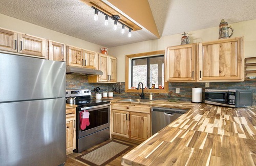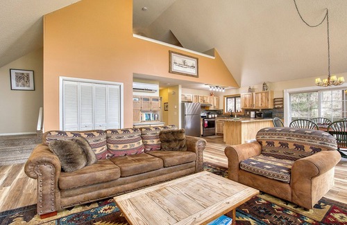 Our chalet has three bedrooms, including two on the main floor with one queen and one full bed, and a master loft with a queen bed and a separate full bath. The bonus bedroom also includes a queen bed. Enjoy the beautiful mountain scenery from our outdoor back patio, complete with another stone fireplace, ample seating, and a fenced-in yard. The front deck includes a grill and outdoor dining area for your convenience.