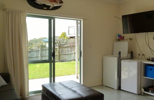The second living area downstairs offers extra space for your group including a lounge with a heatpump, couch and TV, washing machine, fridge/freezer and a bathroom. The downstairs living opens out to a sunny porch and gardens with a view to the seaa and outside table, plus there is a sheltered courtyard where you can relax in the spa!