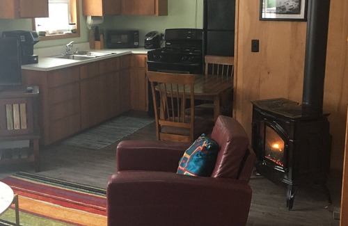 The cabin is well appointed for a short or long-term stay. The living room has a flat screen television, cable television, queen futon sofa, two club chairs, and the gas log stove. Th