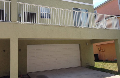 Two private half-length carports by building. No elevator. The great room and master bedroom and kitchen and one of the two baths are on the second floor. The second bedroom with queen bed plus a sleeping loft with daybed, and the washer and dryer are on the third floor.