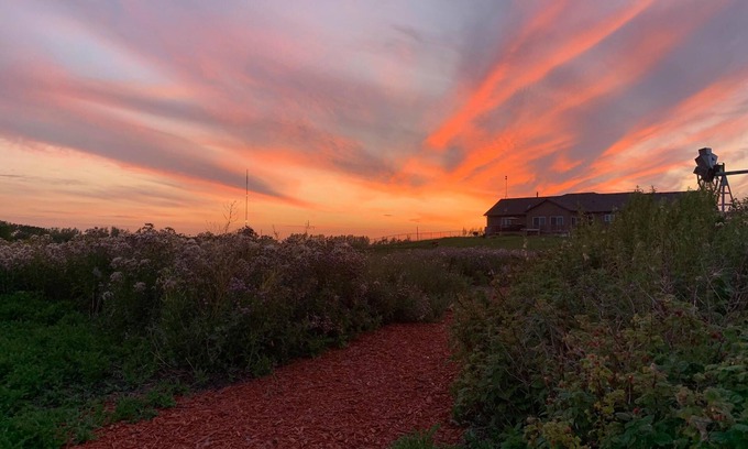 We ask that you respect the land, pond and island. The ecosystems here are very strong and it creates an environment where the creatures who inhabit this space can live happy and fed. Our island is groomed minimally to help maintain these ecosystems. To keep the birds, bees, dragon flies, butterflies and all the other friends who live here at peace, we ask that you stay on the red mulch pathway on the island and do not go into the raspberry bush or wander through the weeds. You may notice there are new shoots of raspberry bush growing around the island, please let them be!