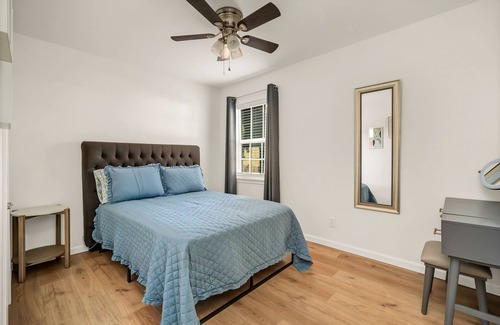 An intimate space, this 1 bedroom unit (1 Queen bed) features and 1 bathroom. The kitchen features solid shaker cabinets and granite tops, stove, electric range, refrigerator, coffee maker and stocked pan/dishes and utensils! Don't bother with the laundry mat, a full size washer and dryer is provided for your convenience.