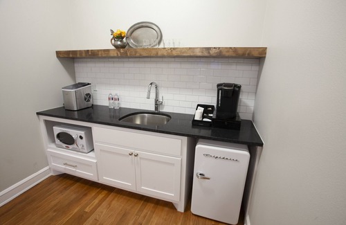 Embrace history and modern comfort in this King-bed suite. Original hardwood floors, wood windows, and millwork shine. A kitchenette, dining area, and workspace offer convenience. Located on the second floor, accessed by stairs, with views of downtown.