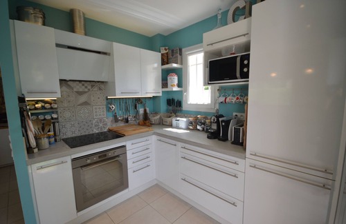 Kitchen, open onto a large living room, very well equipped with dishwasher, induction hob, microwave, oven, large fridge freezer, toaster, nespresso machine, special T-machine and dining area.