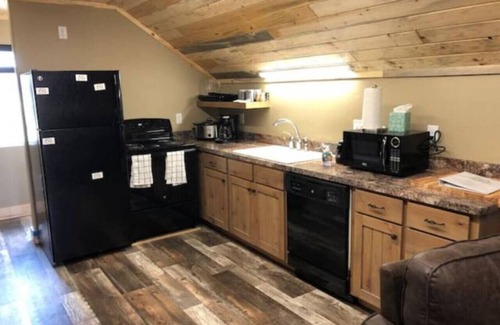 This is the upper floor of the building. The ground level is a shop where we store snowmobiles and the loft is the beautiful living area upstairs. This does not have a deck , hot tub or fire pit. (RV's and camper trailers not allowed)