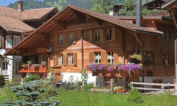 Lauterbrunnen: Rustic, simple chalet "Grosshorn", 2 storeys. In the district of Ey, in a sunny position in the residential district, located by a road. In the house: storage room for bicycles, storage room for skis, central heating system. Parking. Shop 300 m, grocery 500 m, supermarket 600 m, restaurant 200 m, bus stop 50 m, railway station 800 m, outdoor swimming pool 800 m. Tennis 200 m, minigolf, walking paths from the house 50 m, cable car 800 m, skisport facilities 4 km, ski bus stop, cross country ski track 200 m, ice rink. Nearby attractions: Trümmelbach Wasserfälle, Schilthorn Piz Gloria. Well-known ski regions can easily be reached: Mürren Schilthorn, Wengen - Kleine Scheidegg. Well-known lakes can easily be reached: Brienzersee, Thunersee 15 km. Hiking paths: UNESCO-Welterbe Jungfau-Aletsch, Mürren, Hinteres Lauterbrunnental. Please note: ski bus (free of charge). Free ski bus service to the ski region Mürren-Schilthorn. Please note: the owner lives in the same residence. View of the Staubbach Falls.