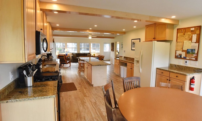 The recently renovated kitchen features expansive granite countertops and a central island with four stools. It is fully furnished with high-quality equipment and utensils—gas stove, large microwave, large fridge, mini fridge for overflow summer beverages, dishwasher, Keurig and drip coffeemakers, toaster, blender, hand mixer, full array of pots and pans, cutting boards, high-quality knives, Oxo utensils, baking supplies, serveware, potholders, etc. Also dishes, silverware, and complete array of glassware for 12-14.