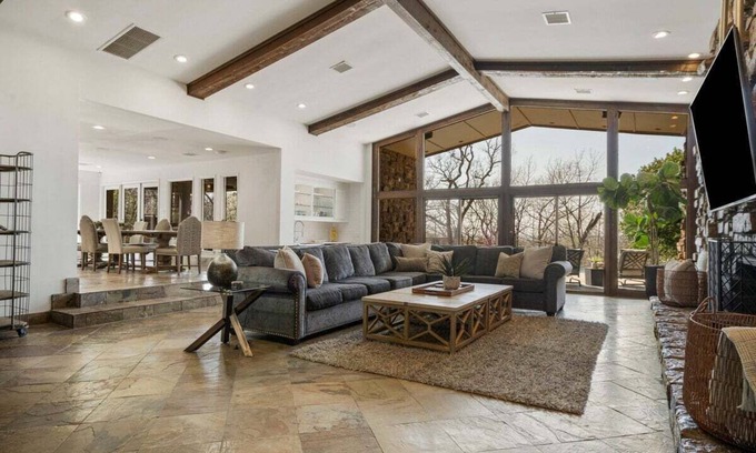 Escape to this stunning stone estate, featuring a breathtaking infinity pool, hot tub, and a chef's dream gourmet kitchen. The luxurious primary suite boasts a jacuzzi tub and a steam shower for ultimate relaxation. This property sleeps 12. Need extra space? The bunkroom sleeps an additional 12, includes a kitchenette, and can be added for an extra nightly fee of $300, plus tax. Whether you're unwinding poolside or hosting a gathering, this home offers elegance and comfort in every corner.