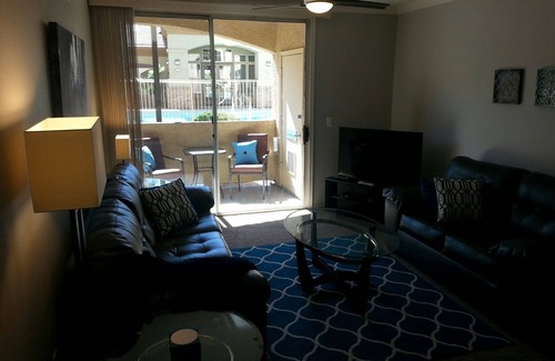Ground floor condo close to pool, spa & fitness room. Sleeps 2 adults in 1 bedroom or up to 4 guests with queen-size sleeper sofa in living room. Queen bed in Master bedroom with full bath and walk in closet. Granite counter tops in kitchen and bath. All kitchen supplies, linens, pool towels, coffee maker, blow dryer provided. Internet service available through Wifi and two flat screen TVs with Direct TV satellite service included. Condo is located on ground floor. All appliances are full-size (microwave, dishwasher, fridge, range/oven, washer/dryer). Sliding glass door off of living room opens to a private patio with bistro set. One designated covered parking spot close to condo. Community pool, spa and Exercise Room are only a short walk from your door.