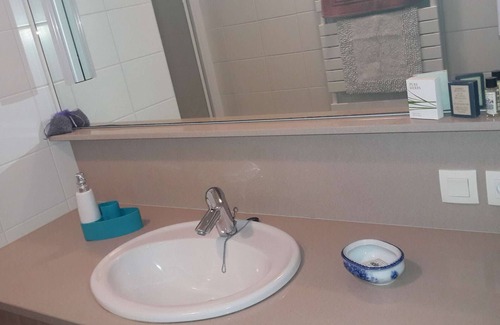 This single-story apartment consists of a bedroom (two single beds pushed together, 90 x 190 cm) and a bathroom with a washer-dryer.