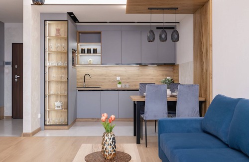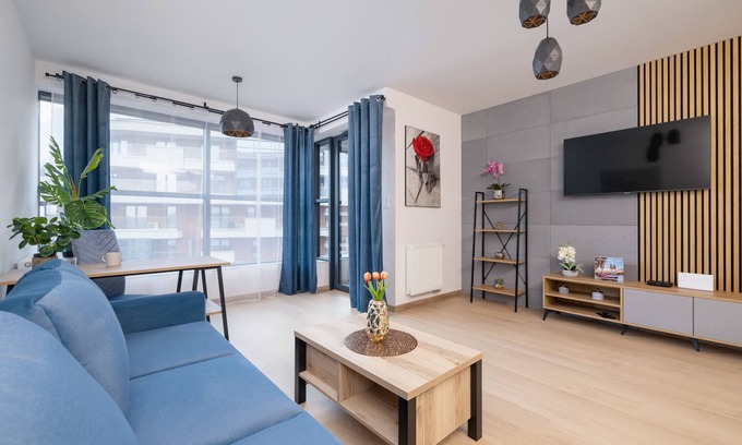 This modern and stylishly decorated apartment is designed for four people. The subtle arrangement is enhanced by dark blue accents, which make the interior look elegant and tasteful. The unit is located on the seventh floor of the building, which can be reached by elevator. In the bedroom, a large double bed is available, as well as a capacious closet where you can store your brought belongings. Storage space for your possessions is also available in the hallway. In the living room there is a double sofa bed and a table where you can drink your morning coffee. Guests can enjoy cable television here. The room also has a dining table with chairs and a desk for comfortable remote work. A functionally equipped kitchenette allows quick preparation of meals. The bathroom features a shower and a washing machine, as well as a toiletries set and a hairdryer. A furnished balcony awaits lovers of outdoor relaxation. Visitors are welcome to come here with their pets - there is an additional fee of 100 PLN/stay. A parking space located in the underground garage hall is available to guests.