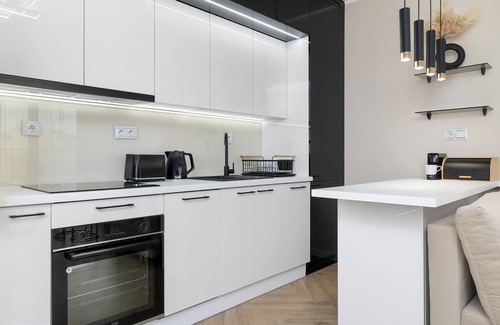 The modern space designed for four people encourages you to stop in the heart of the city, while offering privacy and peace after a day full of excitement. Warm interior shades, consistent style and subtle accents create an atmosphere of coziness that is conducive to shared relaxation and family closeness. The living area combines functionality with aesthetics. Large glazing leading to the balcony provides an influx of daylight, and a comfortable sofa provides additional sleeping space. Right next to it is a fully equipped kitchenette, where preparing meals becomes a pleasure. The kitchen offers everything you need - modern household appliances, a place to cook and a space for shared meals at the table. Morning coffee from a capsule coffee machine drunk on the balcony allows you to start the day in a calm rhythm. The bedroom with a bed provides comfortable conditions for relaxation, offering a quiet space where it is easy to calm down. The interior is decorated with attention to detail, and decorative elements add a personal touch. The bathroom with a shower, washing machine and hairdryer allows you to take care of your daily needs without rushing and stress. The apartment offers a Smart TV and cable TV, and access to fast Wi-Fi allows you to work remotely or relax with your favorite series. The facility is located in a modern building with an elevator, and the immediate vicinity of elegant courtyards and carefully designed architecture of the estate enhances the value of the entire stay. This is an ideal place for families with children and groups who value an urban lifestyle combined with the convenience of everyday functioning. Pets are accepted for an additional fee.