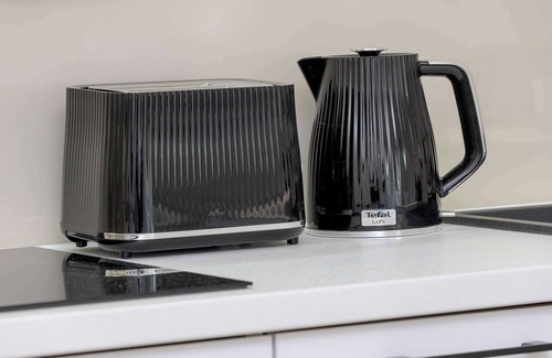 Induction hob, oven, dishwasher, steam extractor, capsule coffee maker, fridge, freezer, electric kettle, dishes, cutlery, wine glasses.
