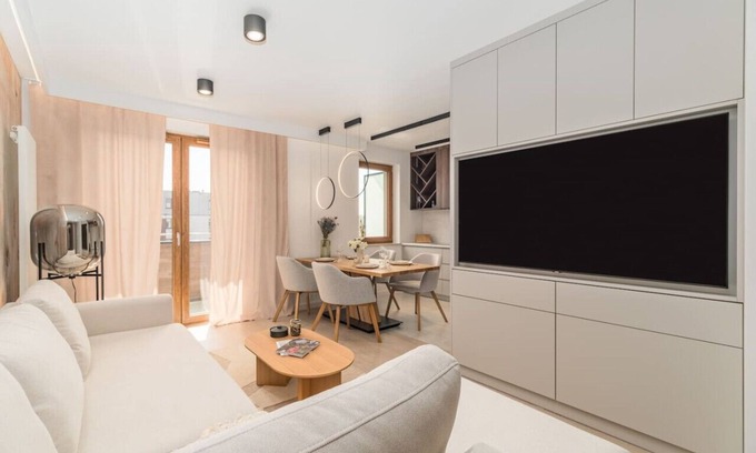 Welcome to this stylish and spacious 61m² apartment on the 6th floor, perfectly designed for up to six guests. Managed by Rentujemy, this beautiful space features three rooms with comfortable sleeping arrangements: one queen bed, one sofa bed, and two single beds. Whether you're here for business or leisure, you'll appreciate the dedicated underground parking, a working desk for your convenience, and a private balcony to unwind after a long day.
