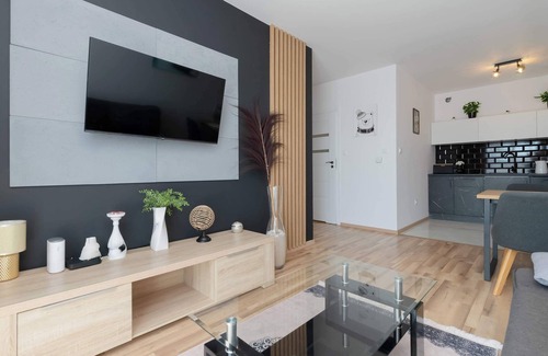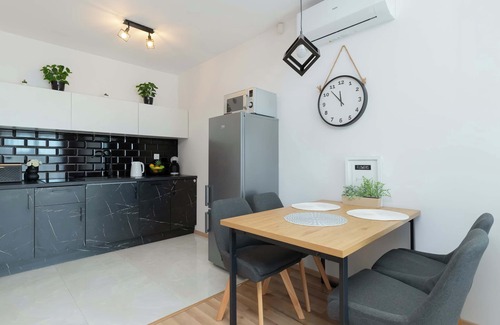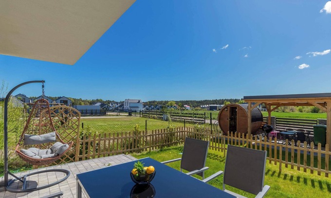 Alicia Apartment is a spacious and comfortable apartment ideal for families with children or a group of friends looking for a convenient seaside base. The location provides quick access to the beach and local attractions, while at the same time guaranteeing a peaceful rest surrounded by greenery. The interior of the apartment has been decorated with functionality and a homely atmosphere in mind. Bright colors, natural materials and modern furnishings dominate, creating a cozy and stylish space. The apartment offers two separate bedrooms, each with a large double bed for a comfortable sleep. The living room has a double sofa bed, where additional guests can sleep comfortably. A fully equipped kitchenette allows guests to prepare their own meals, with an induction cooktop, refrigerator with freezer, microwave and capsule coffee maker. Shared meals can be enjoyed at the dining table, and on warm days a spacious terrace with garden furniture will be a great place to relax. The bathroom has a shower and a hairdryer, and additional amenities such as air conditioning in the living room, Smart Tv, WiFi, a work desk, make the apartment meet guests' expectations. For motorists, a marked parking space is provided directly in front of the building. This is a great option for people who value privacy and proximity to nature, an ideal base for both active recreation and peaceful relaxation on the Baltic Sea.
