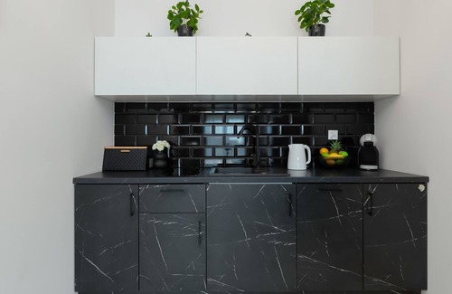 Induction hob, electric kettle, refrigerator with freezer, microwave oven, set of dishes, kitchen utensils, capsule coffee maker