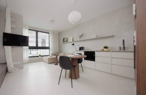 Fashionable and air-conditioned studio of 31 m² located on the 14th floor of a modern building. The interior has been finished with the utmost attention to detail, in a classic grey and beige color palette, complemented by wooden accents. The studio can comfortably accommodate 2 people, making it an ideal choice for couples or solo travelers who appreciate comfort, style and a great location. The highly functional space is divided into a living and lounge area, a kitchenette, a bathroom with shower and a balcony. A comfortable corner sofa that can be separated into a lounge chair and a chaise, along with a TV featuring cable access and Smart TV functions, creates a cozy spot – perfect for relaxing evenings with your favorite series or a good book. The sleeping area is a comfortable mattress on a raised wood platform, which also includes roomy drawers for storage, and behind the drawers are practical storage compartments accessible from the top to accommodate a suitcase and other larger items. In the living area, there is also an extendable table – an additional tabletop is stored in the hallway wardrobe. The minimalist design and light color scheme of the interior promote relaxation and tranquility. On the sheltered balcony, an ideal space awaits for morning coffee or afternoon tea in a cozy atmosphere. The kitchenette is fully equipped and ideal for cooking delicious meals. It includes an induction cooktop, oven with a microwave option and a coffee maker.