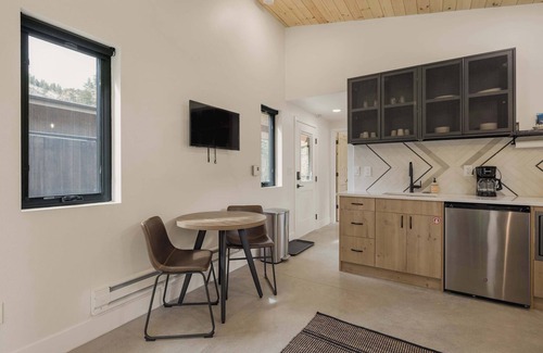 The space sleeps four with a queen bed and sleeper sofa, and is filled with soft natural light, clean lines, and a calming palette that mirrors the forest outside. A compact kitchenette—including a mini fridge, hot plate, and microwave—makes it easy to prepare light meals, while the open layout and vaulted ceilings create an airy, spacious feel.