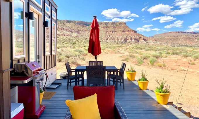 The Guardian Angel is a sleek and modern Tiny with every convenience built in. Aptly named after the majestic white limestone peak overlooking the oasis. Outfitted with full size kitchen appliances and a large bathroom (bathtub / shower), an array of tall windows with a fantastic view, a cozy loft and pull out couch for sleeping, TV, Wifi, Hot Tub, Fire Pit, and all the outdoor amenities to go along with it! The Guardian Angel is the perfect Tiny for the ultimate Zion getaway.