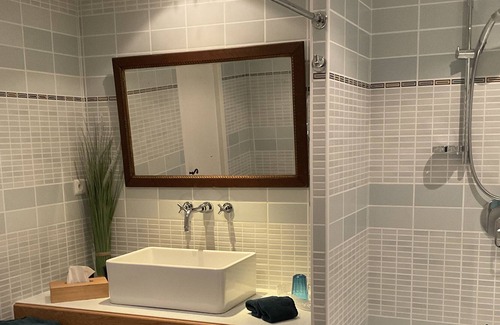 The kitchen is equipped with an oven, a stovetop, and a refrigerator, as well as a coffee maker, an electric kettle, and cookware. Bathroom amenities include a hair dryer, towels, and toilet paper. And you won't have to pack extra clothes, because you'll also have a washing machine. Other amenities include a living room, bed sheets, an ironing board, and heating.
