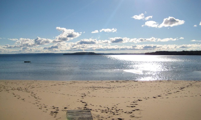 Located directly on the sandy shores of Bowers Harbor, this private, remodeled guesthouse offers a serene setting for beach lovers and nature enthusiasts.