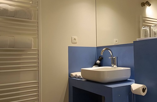 Also located on the courtyard, this room is perfect for a single person or a young couple. The bed is set on a mezzanine overlooking a lounge equipped with leather armchairs and a white lacquered sideboard. The bathroom has a shower and a toilet. The room features a large bed (140 x 190 cm), offering you a comfortable and functional space for a pleasant stay.