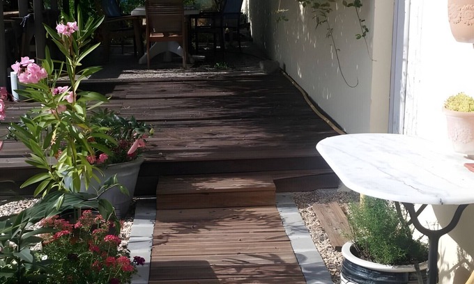 Relax on the shared covered terrace and in the garden at Le Rockin' Chair in Surzur, surrounded by stone walls in this peaceful rural village setting.