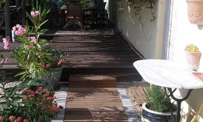 Relax on the shared covered terrace and in the garden at Le Rockin' Chair in Surzur, surrounded by stone walls in this peaceful rural village setting.