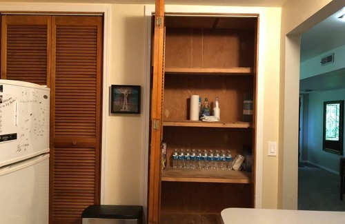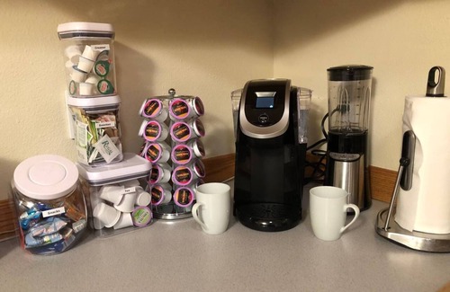 Coffee, tea, and bottled water are available in the kitchen, along with cooking basics—spices and oils.