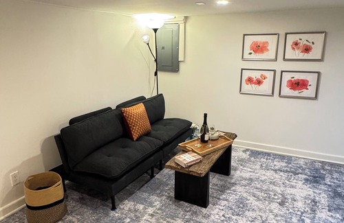 Quiet, recently renovated 1BR suite in our basement with a private entrance, completely private rooms and amenities, and free street parking. Includes fast wi-fi, workspace, kitchenette and sauna.