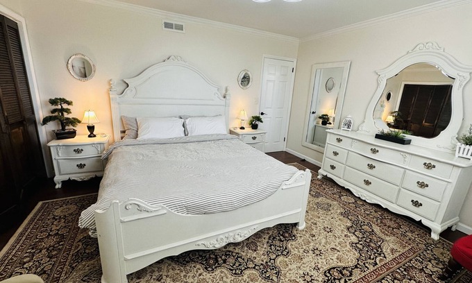 Our guest unit is equipped with a large and inviting bedroom with king size bed, decorated to French Country style. Living Room is equipped with Queen size Murphy bed and can accommodate sleeping 2 more guests at night but can be tucked away during the day. Kitchen fully equipped for cooking and baking. Washer and dryer tucked away in the small closet. The full bathroom has a nice size shower, toilet commode, and the nice vanity with lots of drawers and cabinet. We are located within 10 min from Volkswagen plant and Southern University.