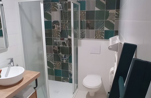 The Green Room, accessible without steps and located in Chozeau, offers a beautiful view of the surrounding hills. This 20 m² room includes a sleeping area and a bathroom, accommodating up to 2 people. You also have high-speed Wi-Fi suitable for video calls, a television, air conditioning, and a fully equipped kitchen accessible from outside (dishwasher, refrigerator, oven, microwave, small appliances, raclette machine, waffle maker, etc.). The accommodation also offers a private outdoor area with a covered terrace and a fire pit.