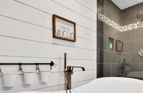 This modern "Magnolia" style house is just the thing for a weekend away. A beautiful master suite with a tulip tub enables its guests to relax after a day of touring local sites and eateries. With two living spaces and a split floor plan, multiple families can easily enjoy a vacation together while still having privacy of their own.