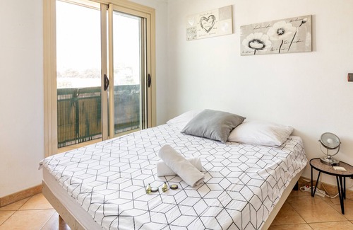 The bedrooms are well-lit and cheerful, with double beds. One room has a big mirror that allows you to get ready with ease. Outside, there is a lovely balcony area with a table and chairs, perfect for enjoying a morning coffee.
