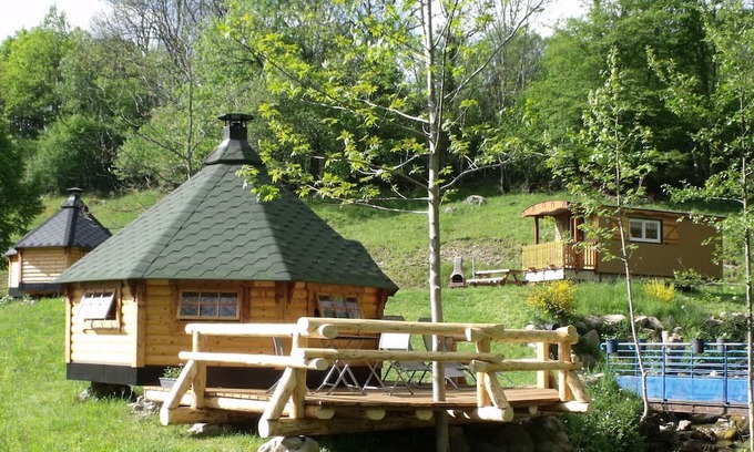 Located near a small stream, the sound of the water will lull you during your stay. carefully decorated and highlighted by discreet multi-colored lighting for colorful evenings, designed for 2 people in a romantic, intimate and charming atmosphere. For one or more dream nights as a couple. It is equipped with a rattan lounge, 1 double bed, refrigerator, wood stove, sanitary area with cold water (excluding frost periods) and dry toilets. Outside, a panoramic terrace overlooks the stream. It is equipped with a table, 2 chairs and 2 deckchairs. - On the domain collective sanitary area with sink 4 showers and 2 WC open 24/24 Animal supplement (€10.00 per day minimum 1 animal. Domaine located on the heights of Ferdrupt has unusual accommodation such as (caravan, yurt, treehouse) Option: -Well-being area by reservation (sauna and balneotherapy bath). To preserve your privacy, Sauna and Balneotherapy access is reserved for you throughout your session with a person on site to advise and guide you. duration 1h 30. your session includes welcome, 20 min balneotherapy session, 20 min sauna, relaxation with refreshing drinks, undressing and dressing included. 2 people minimum per session €22 per person by reservation only. -Massage area only by reservation. -Kota central barbecue grill 10 people maximum €8.50 / person with a minimum of €45 and €11.50 / person with a minimum of €80 for the end-of-year holiday period this price includes wood charcoal battery kitchen dishes. meals and drinks not included. cleaning package €10 and €15 for the end of year celebrations. arrival 12 [hidden] departure 10 [hidden] Optional services to be paid on site and reserved before your arrival: - Pets: 10.0€ per day Property managed by a professional. Unless stated, services such as cleaning, bed linen, towels etc. are not included in the price of this rental. If pets are allowed (information in the advertisement), charges may be applicable. Only equipment mentioned in this advertisement are present. Equipment not mentioned are not considered to be present.