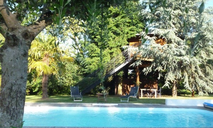 Perched in the trees on stilts, the cabin has a 160x200 bed, private shower room/wc and kitchenette. Equip. extra: Wifi access, hair dryer, TV and home cinema. breakfast basket left in the cabin.