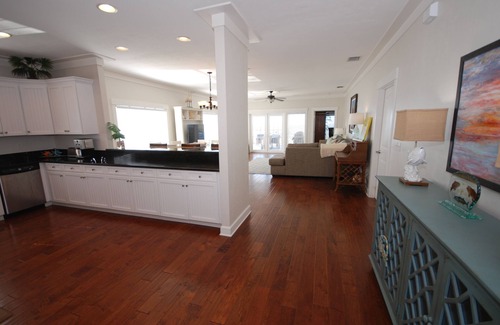 Each condo is comfortably furnished and has a king bed in the master bedroom, which features a large master bedroom window overlooking the serene Gulf of Mexico. The master suite has a jacuzzi tub, shower, his/her vanities and toilet room. The second bedroom features a queen size bed with a full private bathroom, and the third bedroom is furnished with a set of twin bunk beds and an additional twin bed. This bedroom connects to a bathroom that is shared with the rest of the condo. The large, well-stocked kitchen has everything you need to prepare your catch of the day.