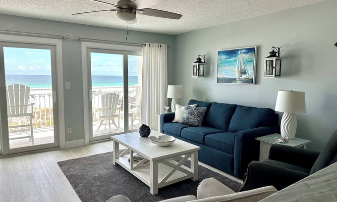 Located on Okaloosa Island, this third level unit is on the top floor of a quiet complex that sits directly on the beautiful white sandy beaches of the Gulf of Mexico. This beautiful beach is our backyard! You just can’t get any closer to the beach! As a smaller condominium complex with 27 units, the beach is much less crowded and we have our own private boardwalk. The unobstructed view of the sparkling emerald waters and the beach from our living room and balcony is spectacular! The brilliant colors of the sunrise and sunsets are captivating. The moonlit nights also display their own glistening beauty across the waters. The spacious living room with two sets of sliding glass doors that open to the balcony overlooking the beach includes a nice comfortable queen size sleeper sofa. The kitchen is fully equipped with new appliances and many extras for those choosing to eat in, and the dining area seats four. There is a washer/dryer in the unit for your convenience. The bedroom has a very comfortable king size bed with a new top notch Sealy mattress set, and a private half bath. The full bath is beautifully updated and located off of the hall. We have nice linens and towels, and our housekeeping service will have our non smoking condo clean and prepared especially for you! There is a reserved parking place for our guest, as well as self check in/keyless entry for your convenience. Our outdoor pool is equipped with bathrooms, lounge chairs, a grilling area, and picnic tables, located in front of our condo. The back of our condo faces the beach, and from the balcony is the gorgeous beach view. The beach service we provide for our guest includes 2 chairs and 1 umbrella, set up daily from Mar 1 through Oct 31. We have two beach chairs in the bedroom closet for our guest as well. Kayak/paddle board rentals are also available during this time. Please remember to bring your own beach towels!