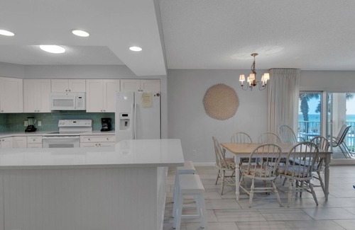 Enjoy beautiful Gulf and pool views from this amazing unit at Sand Cliffs. Unit 214 can sleep up to 7 guests in its 2 bedrooms plus sofa sleeper. The bright white kitchen opens up tot he main living area of the home, allowing for easy entertaining. The large island provides plenty of prep space and storage.
