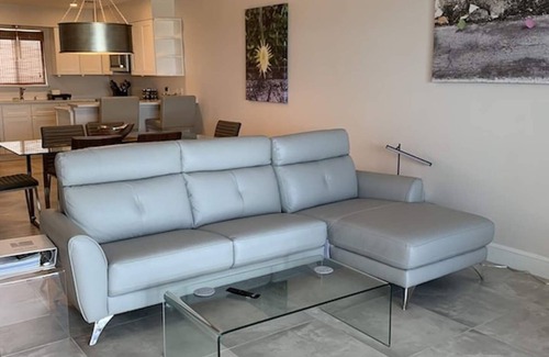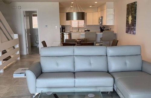 The spacious first level of this home has tile flooring and contemporary furnishings in an open concept living, dining, kitchen area, along with a half bath. The living room has barrel swivel chairs with an ottoman, a sectional sofa, and a 60" smart TV. The open deck off the living room has plenty of seating where you'll enjoy the panoramic gulf views and stunning sunsets unique to this part of the Cape. There is also a gas grill for your convenience.