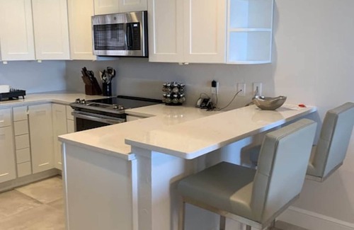 The well-stocked kitchen has all stainless steel appliances and plenty of amenities such as: a coffee maker, blender, electric can opener, mixing bowls, Pyrex dishes, bakeware, pots and pans, dinnerware, glassware, wine glasses, etc. This kitchen has everything you need to prepare any of your meals in the unit so that you can maximize your beach time.