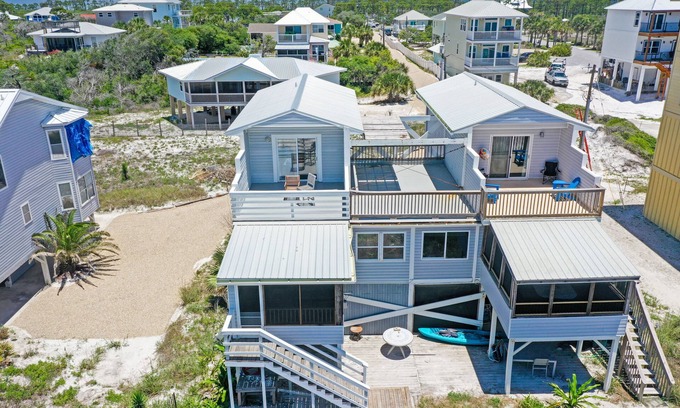 Whataday is an excellent, gulf front duplex centrally located on Cape San Blas just behind the Trading Post. It is a perfect spot for two small families or a larger group of up to 8. This house has a pleasant open-air feel, with views from everywhere. French doors open onto a spacious screen porch with an extra outdoor dining table. On the second level, a private master suite, there is another open sundeck with lounge chairs perfect for lying out while watching the children build sandcastles. Pets are permitted.