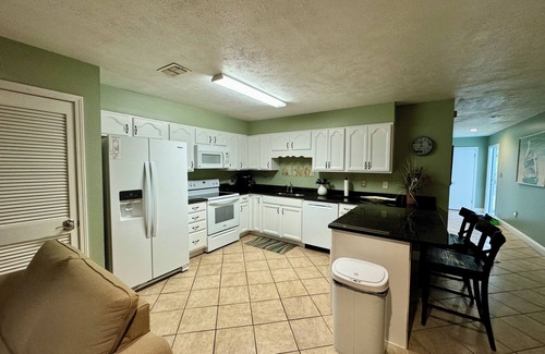 Welcome to this beautiful, gulf front condo ideal for a couple's romantic get-away or a family's beach retreat. The exterior of the property was completely renovated in 2023. Enjoy a King in the private bedroom and a very spacious and comfortable living/dining area. Queen sleeper in living room provides extra accommodations when needed. This one bedroom is almost 900 sq. ft. Fully equipped kitchen, Cable 49 inch 4K Smart TV and DVD in living room and flat screen TV in bedroom plus your own Full Size washer & dryer in unit. Condo includes granite counter tops, tile throughout, and much more. Ground floor accommodations allow you to step right out onto your private gulf front patio where you can relax and enjoy the wonderful gulf views. Take the walkway out to the beach just yards from your door. Enjoy the conveniently located condo complex pool when not on the beach. We often see dolphins swimming along the gulf while we sit having breakfast on the patio! NEW: Your reservation now includes two beach chairs and an umbrella set up for you each morning from March - October!!