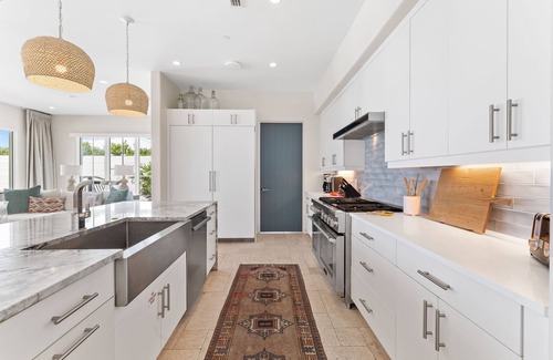 Discover immaculate interiors infused with chic beach accents and polished Travertine tile floors in the open-concept great rooms of both homes. Sliding glass doors with delightful views of the shimmering Gulf create an ethereal backdrop as guests entertain. Luxury Thermador appliances in the spacious, fully equipped kitchens tempt cooks of every level to craft a delectable meal. Both homes feature 8-person dining tables and seating at the kitchen breakfast bar. Plush, double sofas in the living area invite guests to unwind, and the 65” Smart TV and Sonos soundbar set the stage for unlimited entertainment. Outside, an enchanting oasis with 2 natural gas grills, comfortable seating areas, alfresco dining tables, and private pools offer the ultimate spot to savor the sun and salt-tinged air.